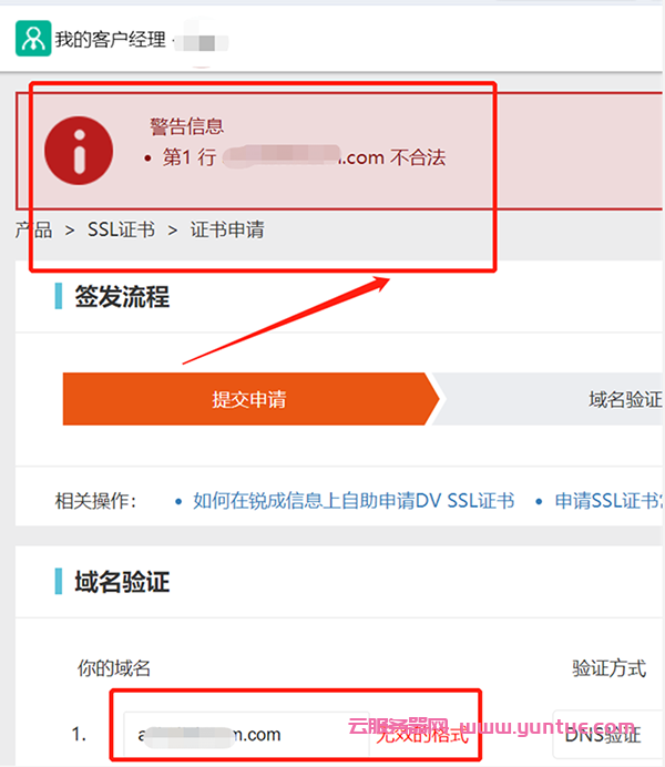解决办法:当提交通配符证书订单时,请确认域名是*.domain.com这种格式,*号不可省略,否则会收到错误提示:无效的域名格式。当申请非通配符证书时,如果填写了*.domain.com这种格式,同样也会收到报错:无效的域名格式;非通配符域名请直接填写为domain.com。