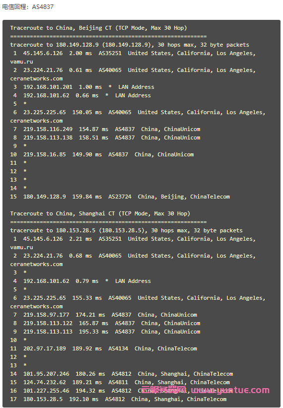 去程三网统一走普通线路,回程三网都是AS4837