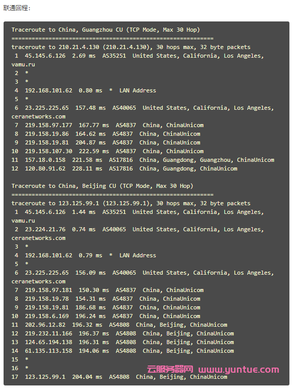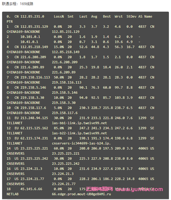 今天,云服务器网(yuntue.com)给大家测试一下六一云新上的AS4837套餐,大家可以参考一下,所有测试都是在晚高峰进行的,所以风格比较空闲的时候效果会更好。而且商家还给大家个小彩蛋所有IP为原生的Cera机房IP,也就是很多人找的23.225/224段,稳定的味道~