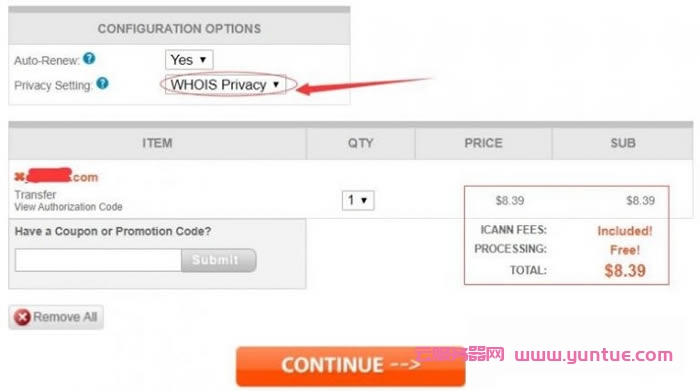 3.进入转移域名续费页面(一般转移域名都需要在迁移目的域名商这里续费一年),我们勾选免费赠送的隐私协议(默认没有的哦),然后点击续费,下单就可以了。