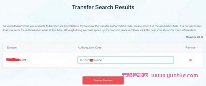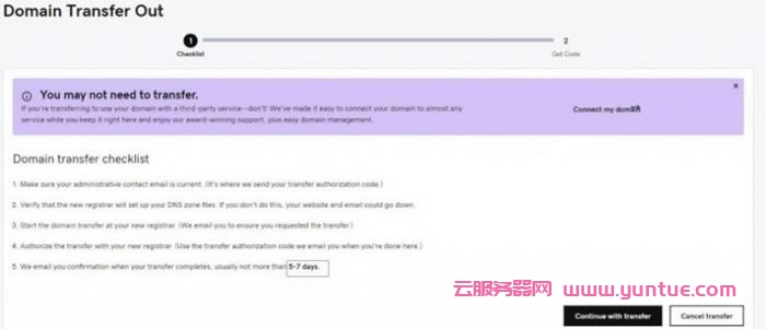 4.进入转移域名设置页面,同意协议,并且可以看到提示,通常迁移需要5-7天时间完成迁移。点击 “ Continue with transfer ”进入下一步,如图