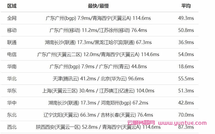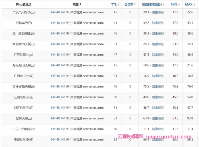 云服务器网(yuntue.com)小编测试了他们香港线路的PING速度,可以看到PING的平均响应速度,最快的仅18.6ms。响应速度来说这一块他们家香港的线路算是很出色的了,并且也没有丢包的情况出现。