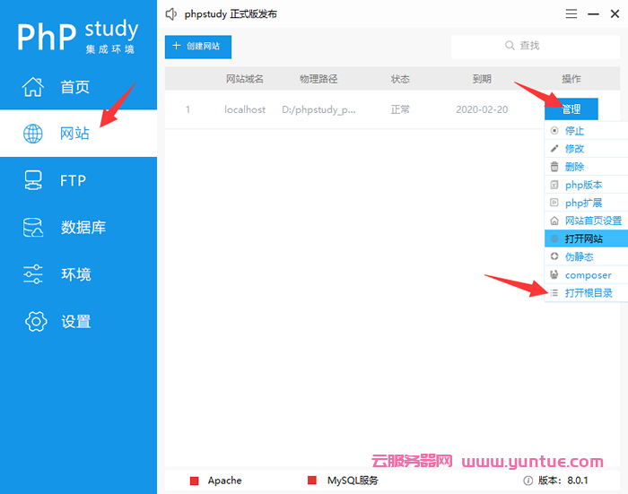 2、点击左侧网站栏目,然后点击右侧管理——打开根目录