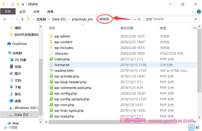 3、弹出的就是我们的网站根目录文件夹WWW,在这里我们我们可以将自己的网站源码上传到WWW根目录,这里我们上传的是WordPress程序。