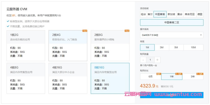 腾讯云全球购在做活动,不限企业或个人用户,针对海外云服务器。我们可以看到香港8核16G1M仅4323.9元/年,12971.7元/3年;8核16G5M仅4722.9元/年,14168.7元/3年;8核16G10M仅6612.9元/年,19838.7元/3年,这里看一下8核16g云服务器价格: