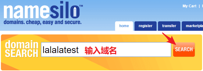 激活账户并登陆,进入主页,在搜索框中输入想要注册的域名,“SEARCH”。