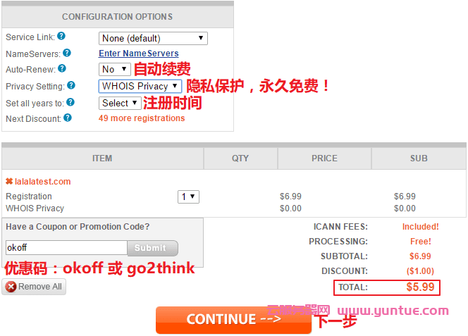确认订单,设置域名续费规则、注册时长等。在 “Have a Coupon……” 处输入优惠码 okoff 或者 go2think ,点击 “Submit”应用,优惠一美元。