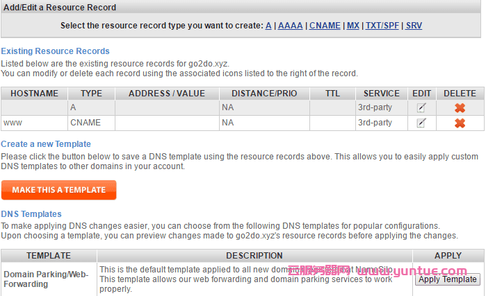 点击 蓝色小球,编辑 DNS,可以自己设置,也可以使用下面提供的模版。一般设置 example.com 和 www.example.com 指向自己的服务器 IP 地址就够用了。