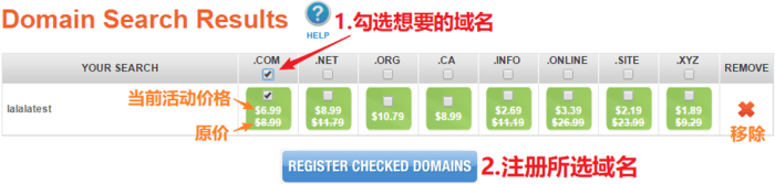 勾选需要的域名后缀,“REGISTER”。如果该域名已被注册,会显示为橙色的 “Registered” 状态,绿色表示可注册。