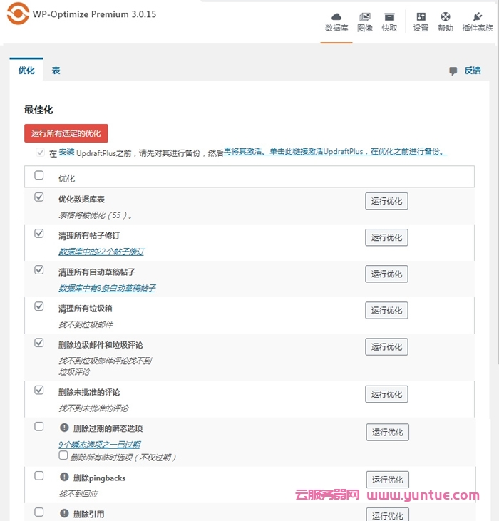进入WP-Optimize设置界面我们勾选并点击“Run all selected optimizations”(运行所有选定的优化)按钮即可对选中的项目进行数据表优化,当然你也可以点击对应优化项目右侧的“Run optimization”按钮对单一数据表项目进行优化。如果你担心插件所坐的优化会损坏数据表原有结构导致网站访问异常可以勾选上红色按钮“Run all selected optimizations”下方的“安装updraftplus之前,请先备份”选项。