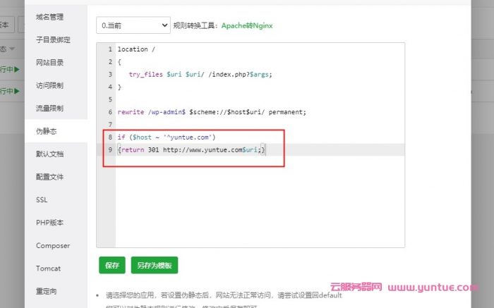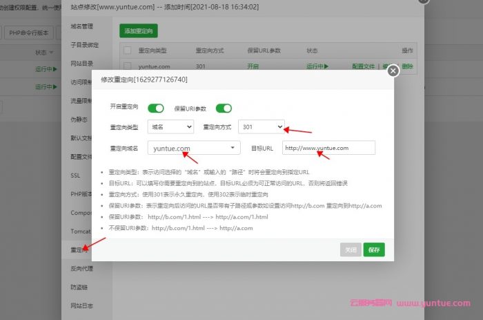 宝塔面板301重定向怎么设置?我们在使用宝塔面板成功建站之后为了权重更加集中,云服务器网(yuntue.com…