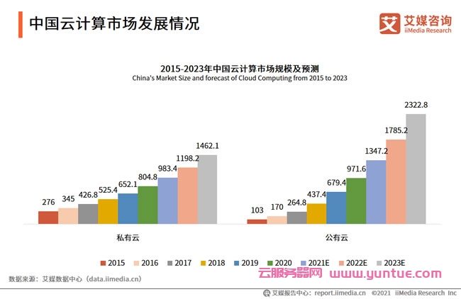 iiMedia Research(艾媒咨询)数据显示,2020年中国云计算市场规模达到1776.4亿人民币,较2019年增长33.41%,预计2021年维持现有增速,达到2330.6亿人民币;公有云规模在2019年超过了私有云,成为了第一的主要市场。