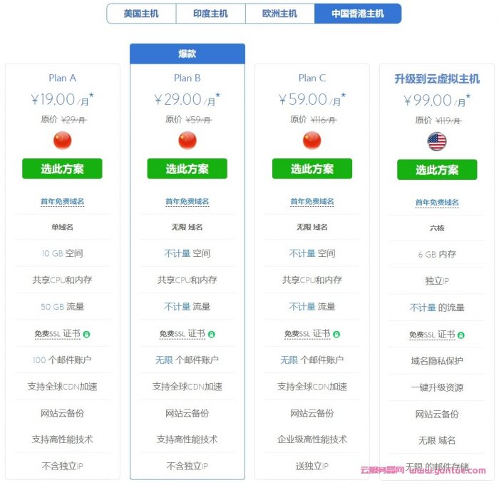 BlueHost香港虚拟主机采用的是稳定强大的主机架构,保证了99.9%正常运行时间,自带有cPanel面板或Plesk面板,便于管理主机。BlueHost香港虚拟主机有Plan A、Plan B、Plan C三种方案,每月低至19元,支持Windows和Linux操作系统,首年可享有免费域名后缀(如.com、.net、.cn、.org等),赠送免费SSL证书、网站云备份等,并且BlueHost提供有24小时技术支持服务,方便用户在遇到问题时可以及时得到解决。