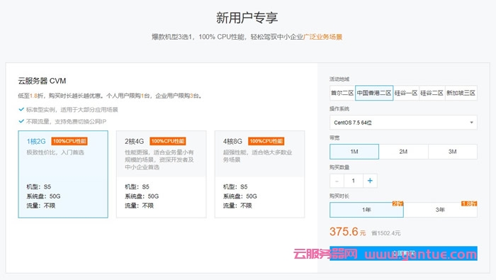 标准型S5 1核CPU、2G内存、50G系统盘、1M带宽、独立IP,375.6元/年,1014.12元/3年。 <<直达活动购买