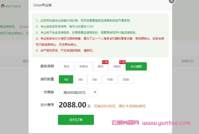 另外提示:目前有所谓的拼团购买活动,其实就是有人购买了宝塔Linux专业版多台永久授权为捆绑销售方案是为了让一个人有多台机器的享受优惠,所有授权绑定在一个账号上,低价格和别人购买时存在风险的,因为你是不可能拿到主账号了!所有一般建议自己购买授权。