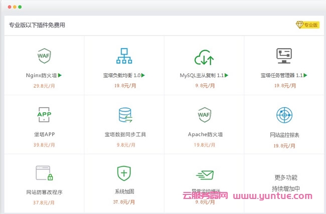 宝塔Linux专业版在免费版所有功能的基础上,额外还有网站防火墙,防篡改,系统加固,网站监控报表,负载均衡,主从复制,任务管理器,以及未来可能会开发的木马查杀功能。永久版还有专门的群,问题会得到优先跟进。