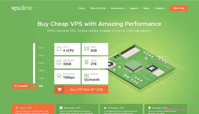 | VD6GB7 | 4核 | 6 GB | 30 GB SSD(RAID10) | 2 TB / 月(10Gbps端口) | 1个 | $7/月 | 购买链接 |