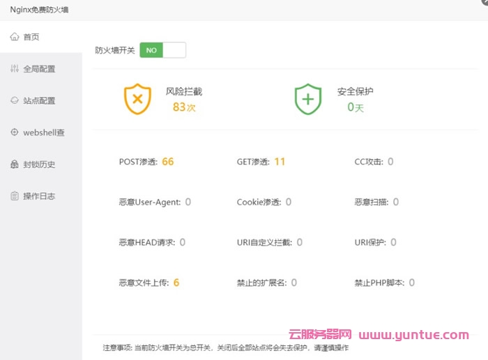 对比了全局设置和站点设置下专业版防火墙和免费nginx防火墙提供的所有项目,可以看到在防御方面免费防火墙还是缺少了很多项目。包括post过滤、Cookie过滤、URL过滤、禁止执行某些文件、拦截、API接口防御等等。