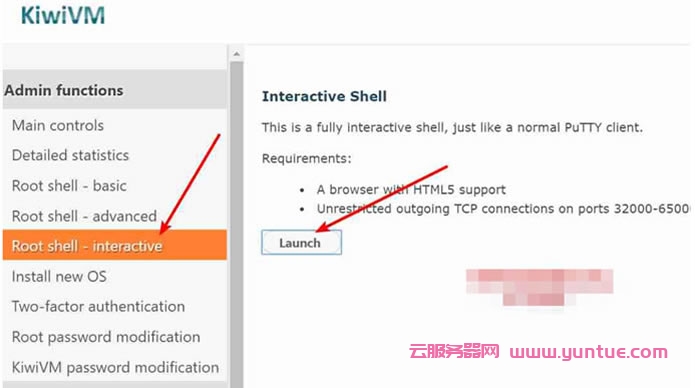 进入KiwiVM后台,怎么进入?这种基本操作我不会再多说。然后点击“Root shell – interactive”,再点击“Launch”进入。