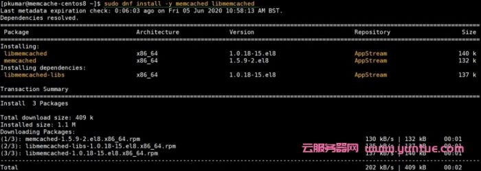 由于Memcached软件包及其依赖项位于AppStream存储库中,因此我们将使用默认的软件包管理器安装Memcached,如下所示: