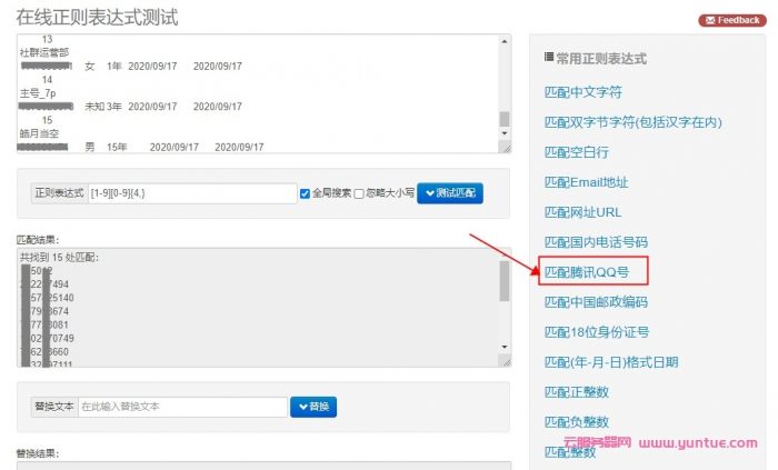 3、打开在线正则表达式地址 http://tool.oschina.net/regex 粘贴刚才复制的内容,再点击“匹配腾讯QQ号”即可看到匹配结果了。如下图: