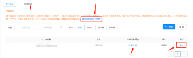 佣金确认请在每月19日18:30前完成,逢节假日提前至19日前的最后一个工作日18:30前确认完成,过时不确认将默认为“已确认”即显示“待结算”状态: