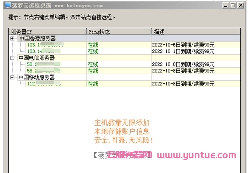 4、主机IP帐号密码,保存本地,本地单机软件,不上传数据,菠萝云官方自用;