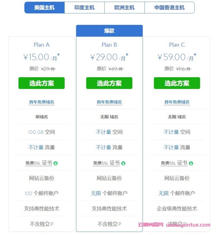 BlueHost美国虚拟主机除了性能优越、管理简单外,价格也比较便宜,每月15元起。不管是Linux虚拟主机还是Windows虚拟主机,都有Plan A、Plan B、Plan C三种方案,首年享有免费域名,提供有免费SSL证书和网站云备份服务,可选无限域名、不计量空间和流量的方案。