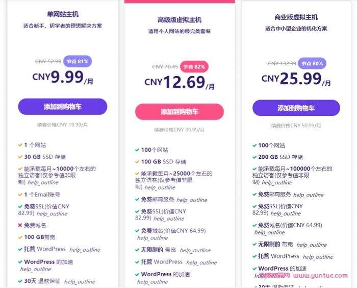 Hostinger美国虚拟主机按照建站数量的不同,分为单网站主机、高级版虚拟主机和商业版虚拟主机,前面两种虚拟主机比较适合初学者用于搭建个人网站,价格比较低廉,每月4.75元起,但内存和CPU配置不高,CPU仅1核,内存是768 MB和1024 MB。商业版虚拟主机是适合中小型企业的优化方案,CPU起步是2核,内存在1536 MB,每月20.35元起,性能上要优越点。