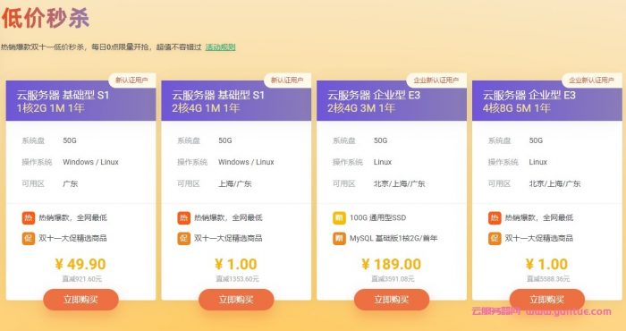 1、低价秒杀:仅需1元/年,即可享受稳定的计算、内存和网络资源。基础型s1云服务器(2核4G )1元秒杀,企业型e3云服务(4核8G )1元秒杀,用最低价格助你上云。