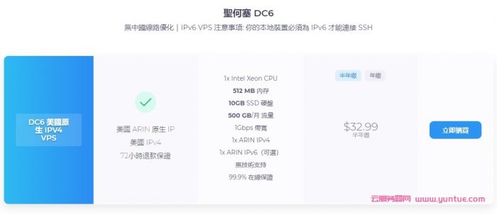 | 美國原生 IPV6 VPS | 1核 | 512M | 10G | 500G/月 | 1G | 1个 | $34.99/半年 | 链接 |