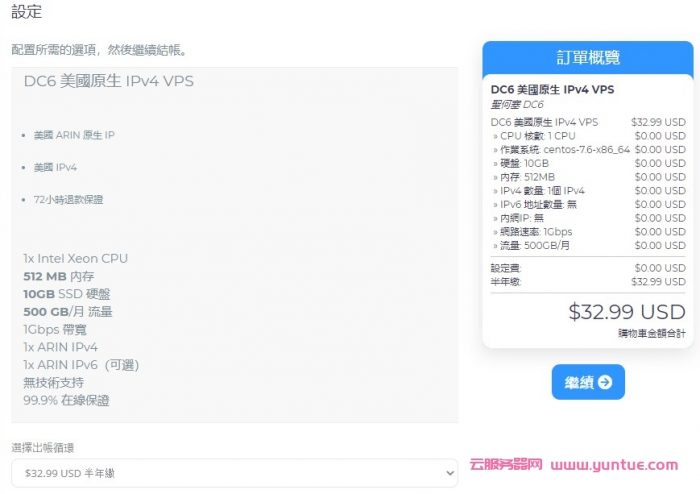 | DC6美國原生IPV4 VPS | 1核 | 512M | 10G | 500G/月 | 1G | 1个 | $32.99/半年 | 链接 |
