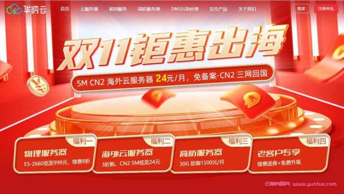 华纳云【双11钜惠出海】活动现已开启,【1】美国/香港物理服务器低至688元/月:香港服务器专享10M CN2 GIA,美国服务器30M+20M CN2/100M国际带宽可选(送20G防御);【2】海外高防服务器30G防御低至1188元/月;【3】香港高防IP 2240元/月;【4】美国/香港云服务器,全场低至3折,香港云2M CN2 32元/月;美国云5M CN2低至24元/月(送10G防御),【5】美国高防云30G防御低至588元/月。