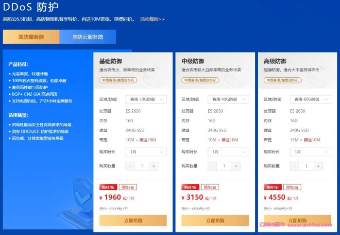 高防云6.5折起,高防物理机尊享特价,再送10M带宽。续费同价。