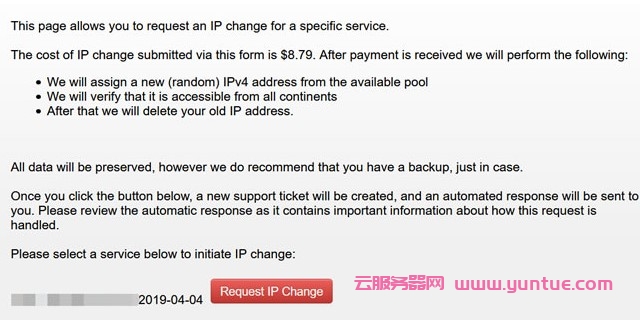我们可以看到可以需要更换的搬瓦工主机,然后点击Request IP Change按钮。然后可以看到申请的工单去更换。不过这个是人工的,我们付款之后等待人工处理。