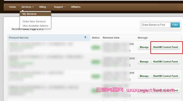 首先要先登录KiwiVM的控制面板,具体的操作是,先登录客户中心,在Service-My Service下,选择自己要操作的VPS,然后点击KiwiVM Control Panel,进入到KiwiVM面板。