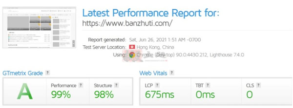 比如搬主题已经进行了自己站点的大量优化,包括主机及各类细节优化,基本能保持PageSpeed Insights的桌面端得分在80-90分之间,移动端得分在30-50分之间(移动端优化一直是搬主题的心中的痛,┭┮﹏┭┮)。而GTmetrix得分一般最好成绩在A(Performance为91%,Structure为96%),但是不是很稳定。因此接下来的优化介绍主要是建立在前期的优化基础上,而对于站点没有进行太多优化的小伙伴,可以多看一下搬主题站点的文章。使用此教程理论上可以得到30%-60%的评分提升。