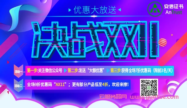 一年一度的“双十一”即将到来。安信SSL证书也携手各大权威CA机构推出双十一促销活动,全场ssl证书申请限量7折,更有部分证书产品低至4折,活动优惠力度年度最大。不论是企业还是个人,活动期间申请SSL证书不仅能享受优惠价格,更能享受从申请到安装部署一站式服务,省时更省心!