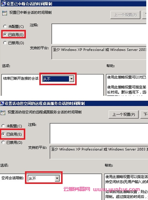 和2008系统一样,同样将”为断开的会话设置时间限制“和”到达时间限制时终止会话“这两个设置启用,并把对应的选项都设置为”从不“(同上图2008的界面一样)。
