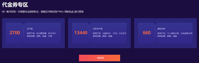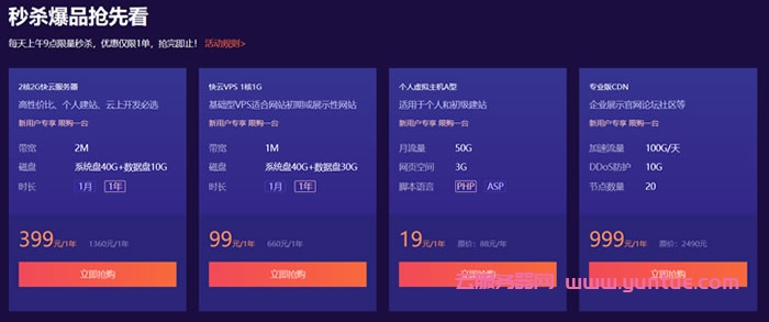 我们可以看到每天上午九点,有优惠秒杀活动。包含2M2G云服务器、快云VPS、虚拟主机等。
