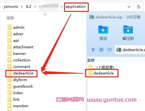 下载安装转换插件–>dedecm转换至yzmcms插件,下载完成后解压,将得到的整个文件夹,放置网站根目录下的application文件夹内,如下图所示: