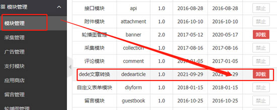 安装放置好后,回到网站后台在左侧找到【模块管理】点击下面的【模块管理】,在右侧找到【dede文章转换】,如下图点击安装(我这里已经安装好了,没安装的会显示【安装】);