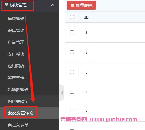 安装完成后,刷新下页面,即可在左侧菜单栏【模块管理】下看到【dede文章转换】插件,点击则会自动同步原dedecms网站上的文章内容过来,转换时间由文章数量而定,目前设定的时间为每3秒转换一篇文章,静待装换完成即可,注意:转换期间请勿关闭页面。