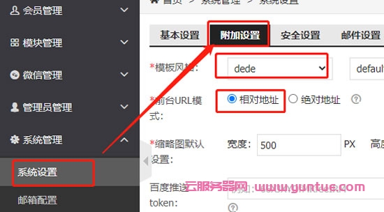 完成第六步后,回到网站后台,在左侧菜单栏找到【系统管理】–>【系统设置】–>【附加设置】,按照下图所示设置好后,点击保存。