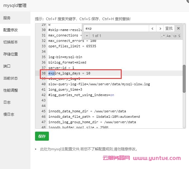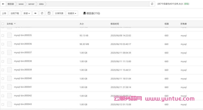 其实,这个是MySQL二进制日志,默认保留10天mysql二进制日志。此日志的作用用于数据库故障时候恢复数据库使用,如果占用不是很大,磁盘空间允许,建议保留。不过宝塔官方给出的回答是这样的,但是个人也遇到过几次,有时候安装的会有时候安装的宝塔就不会出现这问题。如果不需要日志功能就在MYSQL的修改配置里面,找到log-bin =mysql-bin把他注释掉。这样#log-bin=mysql-bin。