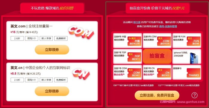 活动期间 新注册 的用户可免费开盲盒,随机获得1元购域名资格 查看已获得奖品请至 费用-优惠券管理