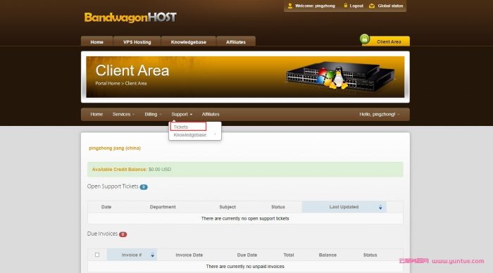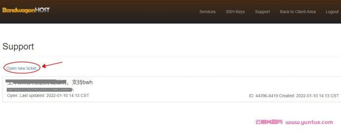 进入搬瓦工官网之后,登录到后台,然后点击Support -> Tickets,就可以看到目前新版的工单页面。