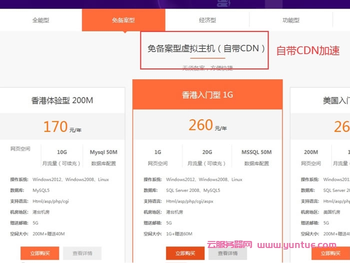 点击“免备案型”,可看到香港云互联的免备案虚拟主机是自带CDN的,(CDN技术可提速、防御)