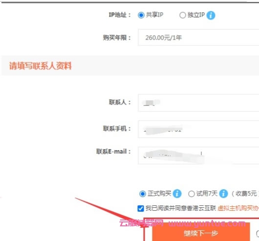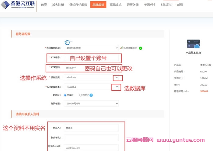 3、如选择“香港入门型”点击“立即购买”转下页设置“FTP账号”也可以重置“FPT密码”,依次选择“操作系统”、“MYSQL版本”、数据库购买年限。最后完成下面的联系人资料后点击“继续下一步”