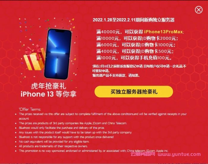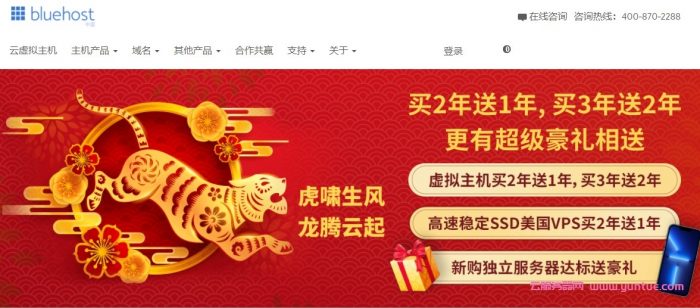 bluehost正在举行虚拟主机虎年春节优惠活动,这次BlueHost的春节虎年优惠活动力度还是蛮大的,虚拟主机满2年送1年,买3年送2年。同时买独立服务器还有豪礼相送,如果我们有在选择BH主机商的可以看看是不是需要新购。如果续费比较贵的话,我们可以直接新购。